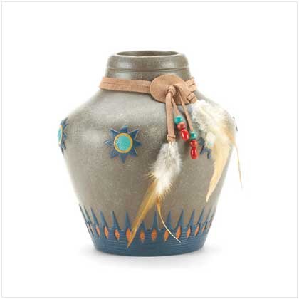 Blending an appealing stone finish with the hues of a desert sunset, here's a real Southwestern treasure! Accented with leather, feathers and bright beads. 7 3/4" diameter x 8" high.