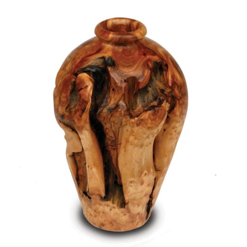 Turned from highly variable reclaimed roots and stumps, these urns and vases are each unique works of the turner's art. Some are smooth with Birdseye grain, while some have deep rifts and gnarled knots, or combinations of both. Great by themselves or in decorative groups, these spectacular pieces are true examples of the beauty of nature. Each of our hand turned root vases and urns is uniquely beautiful and stands alone as a natural work of art. These fantastic pieces are turned from a species of Chinese Fir called Shan Mu, which grows abundantly in the mountains of central China. The stumps left by logging are reclaimed prior to replanting and hand-carved by local artisans into the shapes in this collection. They are beautiful decorative items that bring their own unique organic charm into the home. Each piece is a one-of-a-kind. Food-safe lacquer finish. Hand wash. Knotholes and minor cracks add a unique charm.