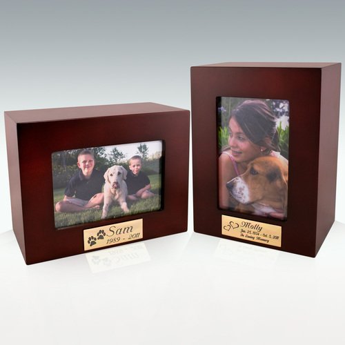 The Versa urn holds your favorite 4 x 6 photo, landscape or portrait style. The photograph inserts behind a protective piece of glass. An optional brass engraved plaque and drawstring bag are available to create a truly personal memorial for you beloved friend. When you receive your order the plaque will not be attached to the urn, you are given the option of mounting the plaque on the urn how you would like it. The plaque is easily attached with a double sided tape. An optional engraving can be done in either a script or block style font. Engraving can be up to 3 lines with a total of 35 characters on each line. Optional artwork may also be engraved. (See images above) Please contact us regarding the text for your engraving.
