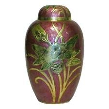 9504-10 Features: -Adult urn.-Material: Brass.-Threaded, airtight screw-on lid and comes with a velvet carrying pouch.-220 CI capacity. Color/Finish: -Blazing burgundy color with golden flowers in a spectacular display. Dimensions: -Height: 10''.